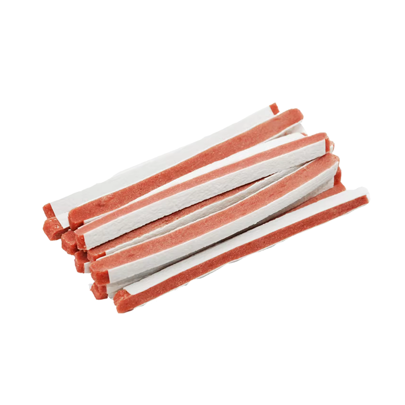 Chunks of salmon wrapped in thin sheets of natural rawhide beef skin, complemented by duck and swordfish fillet. Doesn’t it sound like a fancy restaurant menu? But this chewy treat does more than delight the taste buds. It enhances your dog's well-being by providing fatty acids, proteins, vitamins, and minerals. Ingredients: Salmon, duck, cutlassfish, Black soldier fly meal, corn starch, glycerin, sorbitol, plant proteins, wheat flour, minerals.